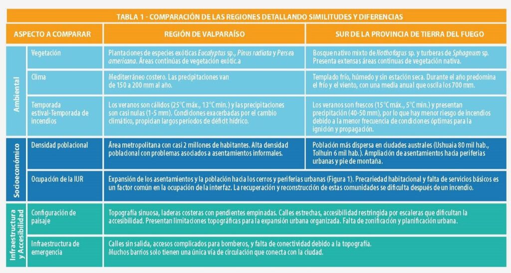costeras de la región de Valparaíso en Chile y la región sur de Tierra del Fuego en Argentina, aunque separadas por más de 3.500 km, comparten una preocupante similitud: su vulnerabilidad frente a incendios en la IUR (TABLA 1). La comparación entre Valparaíso y Tierra del Fuego (Ushuaia y Tolhuin) destaca la importancia de una gestión integral del riesgo de incendios, que aborde aspectos sociales, económicos y ambientales. La combinación de entornos urbanos y naturales crea un escenario complejo y desafiante para la prevención, control y combate de incendios forestales. Aunquecada región es única, ambas se caracterizan por su configuración montañosa y sus asentamientos humanos en cerros lo que aumente considerablemente el riesgo ante incendios en la IUR. Esto subraya la necesidad de fomentar una cultura de uso responsable del fuego para proteger tanto a las comunidades como a los ecosistemas adyacentes.